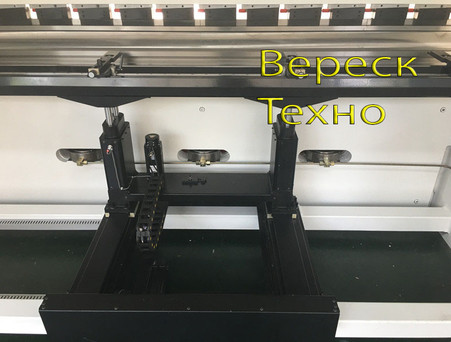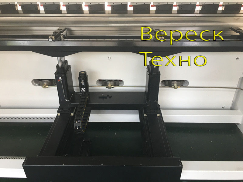 Ход задних упоров. Самая передовая электрогидравлическая синхронизирующая система сервоуправления с замкнутым контуром. Подходит для получения изделий, с большим количеством сгибаемых углов и высокой точностью. Перемещение оси X осуществляется за счёт ШВП, линейных направляющих и серводвигателя. Задние упоры обладают высокой прочностью и точностью перемещений. |